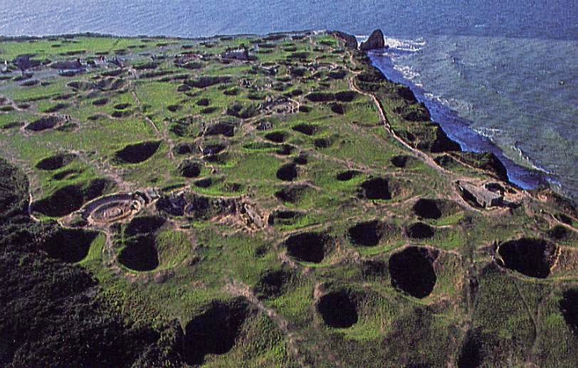 1) Prior to the invasion, massive amounts of bombs fell and Naval guns fired upon Hitler's "Atlantic Wall." It must have been hell to be German soldier that morning. One location in particular has been preserved as closely as possible to the way it looked back then. Pointe du Hoc is atop a cliff and sticks out into the sea, and there were some huge guns installed there in concrete bunkers. It should have been blown to smithereens, but enough Germans survived to put up a fight against the Army Rangers who scaled the cliff with ropes & ladders in order to destroy the guns.